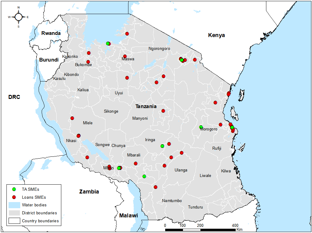 Map of SMEs in Tanzania receiving loans or technical assistance supported by Aceli